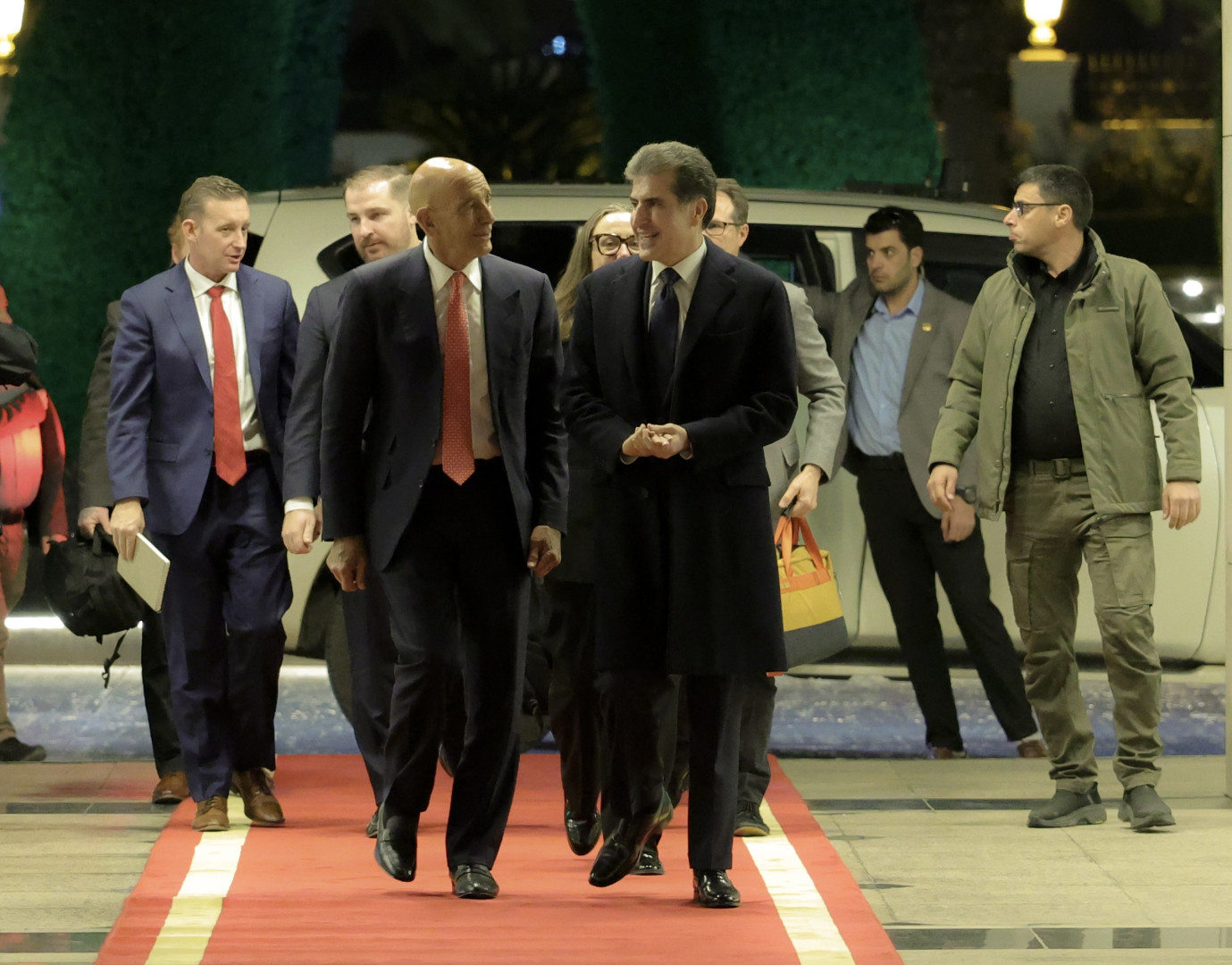 Êvara îro Şemî, 17.01.2026an, rêzdar Nêçîrvan Barzanî, Serokê Herêma Kurdistanê, pêşwaziya birêz Tom Barrack, nûnerê Serok Donald Trump ji bo karûbarên Sûriyê û Balyozê Amerîka li Tirkiyê û şandeke pê re kir.